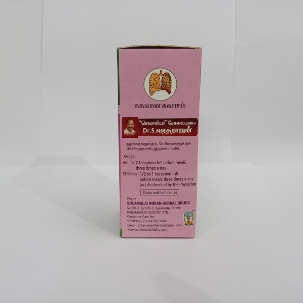 Crafted by Solamalai Indian Herbal Drugs, the syrup is made with authentic herbs, carefully processed to preserve their medicinal potency. It is a safe, natural, and effective solution for families seeking relief from cough and respiratory discomfort without harmful side effects.