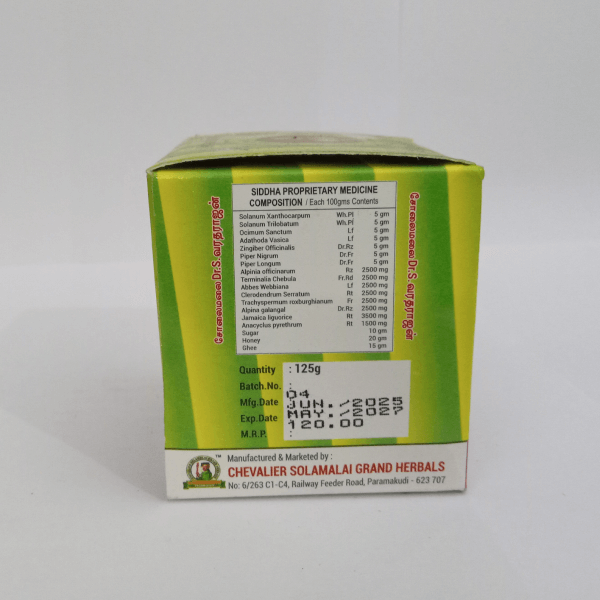 Prepared by Solamalai Indian Herbal Drugs, this cough lehiyam is made using age-old methods to ensure purity, potency, and effectiveness. It soothes the throat, clears phlegm, and supports stronger lungs, making it an ideal natural remedy for both adults and children.