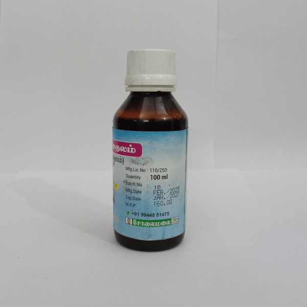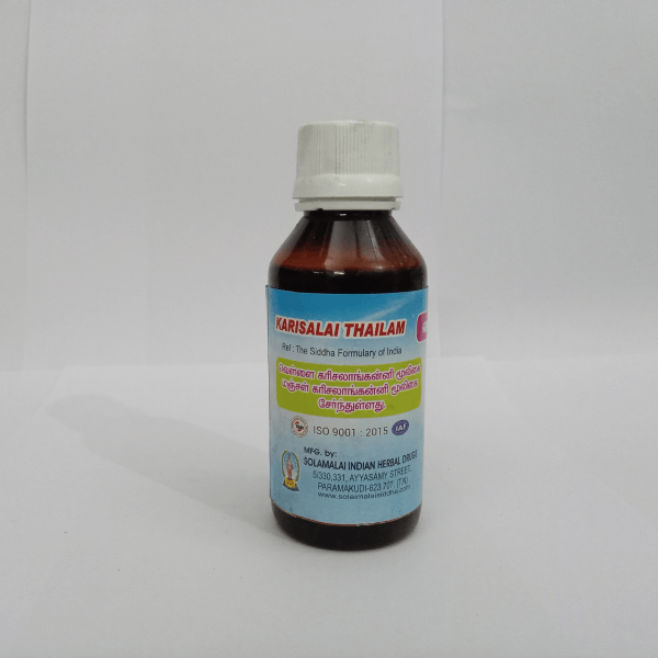 Solai Malai Karisalai Thailam is a 100% natural herbal oil prepared using Karisalai (Eclipta alba), a well-known herb in traditional medicine. This oil is designed to strengthen hair roots, nourish the scalp, and provide a natural cooling effect to the body and mind.