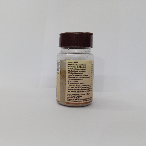 Simandhar Dant Dhavan Tooth Powder is a traditional Ayurvedic oral care blend crafted to support strong teeth, healthy gums, and long-lasting freshness. Made with powerful herbs like Neem, Clove, Triphala, and Babool, the powder helps reduce plaque, prevent cavities, and soothe sensitivity—offering a natural way to maintain oral hygiene.