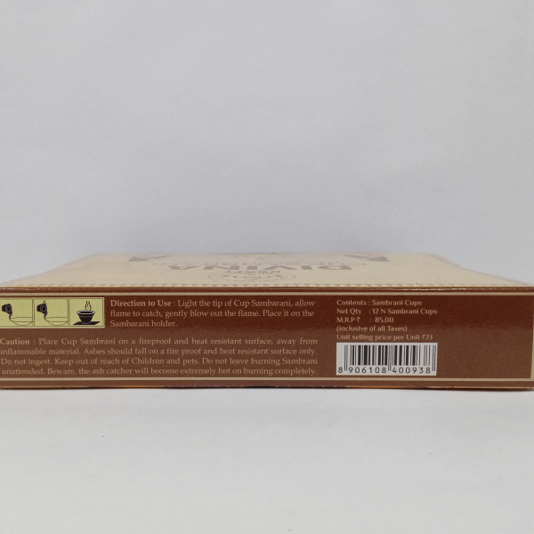 Divina Cup Sambrani is a traditional sambrani dhoop presented in a convenient cup form. Crafted using natural aromatic resins and herbal blends, it releases a rich, soothing fragrance that enhances spiritual focus during prayers and meditation.