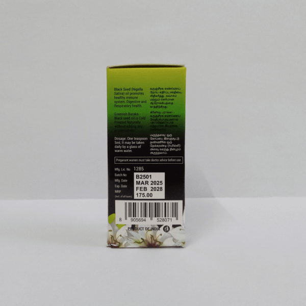 Greenish Baraka Black Seed Oil is a premium-quality herbal oil extracted from Nigella Sativa (Kalonji/Black Cumin Seeds), known for its powerful healing properties. Rich in essential fatty acids, antioxidants, and vitamins, this oil supports overall health, strengthens the immune system, and promotes healthy skin and hair.