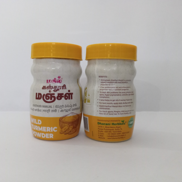 Dharani Herbals Kasthuri Manjal Powder is made from pure Wild Turmeric (Curcuma Aromatica), traditionally used in Indian beauty care for bright, glowing, and blemish-free skin.